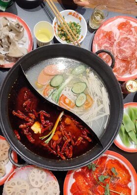 Una vera e propria fonduta cinese, con brodo bollente in cui immergere carne, verdure, tofu o noodles.